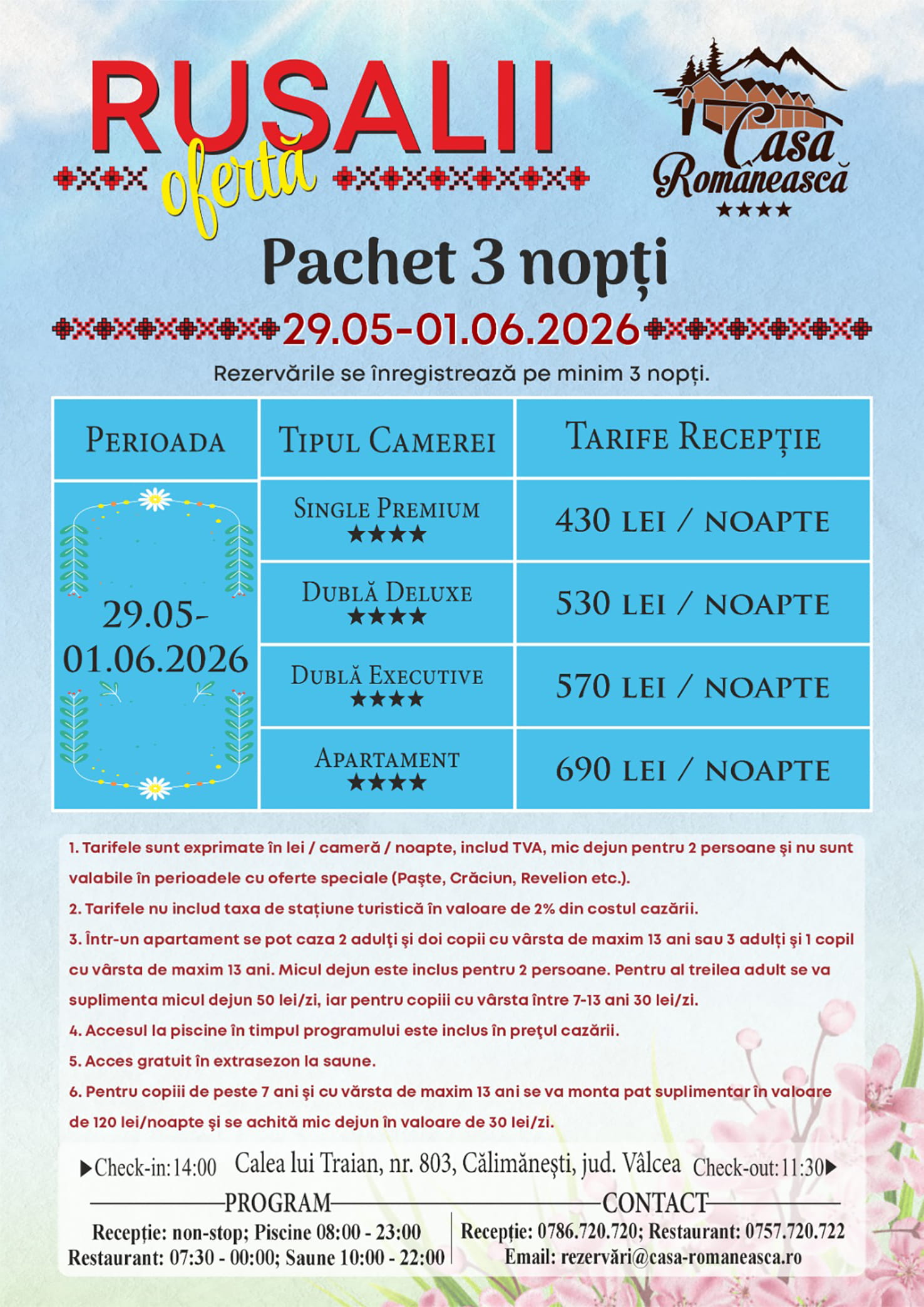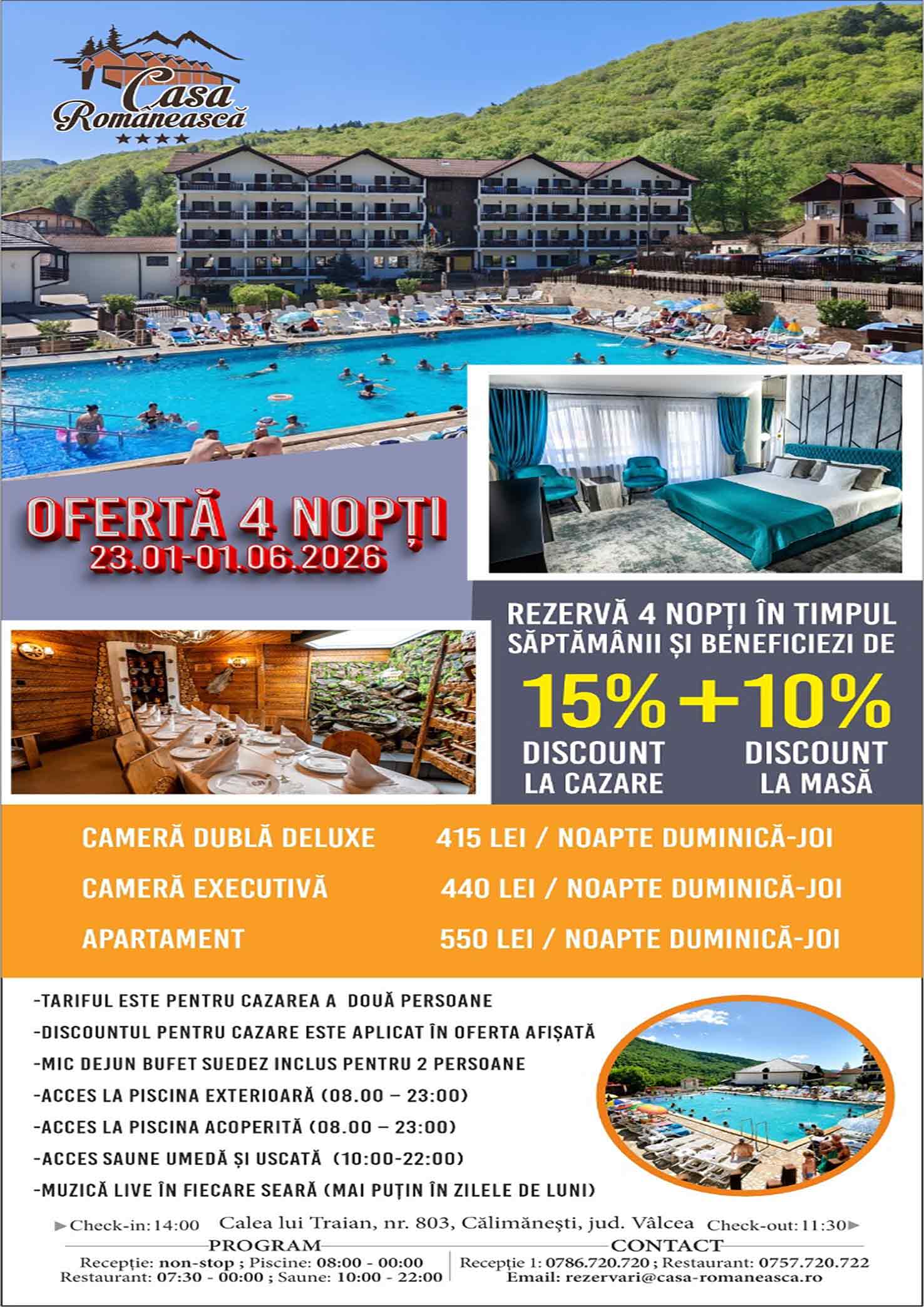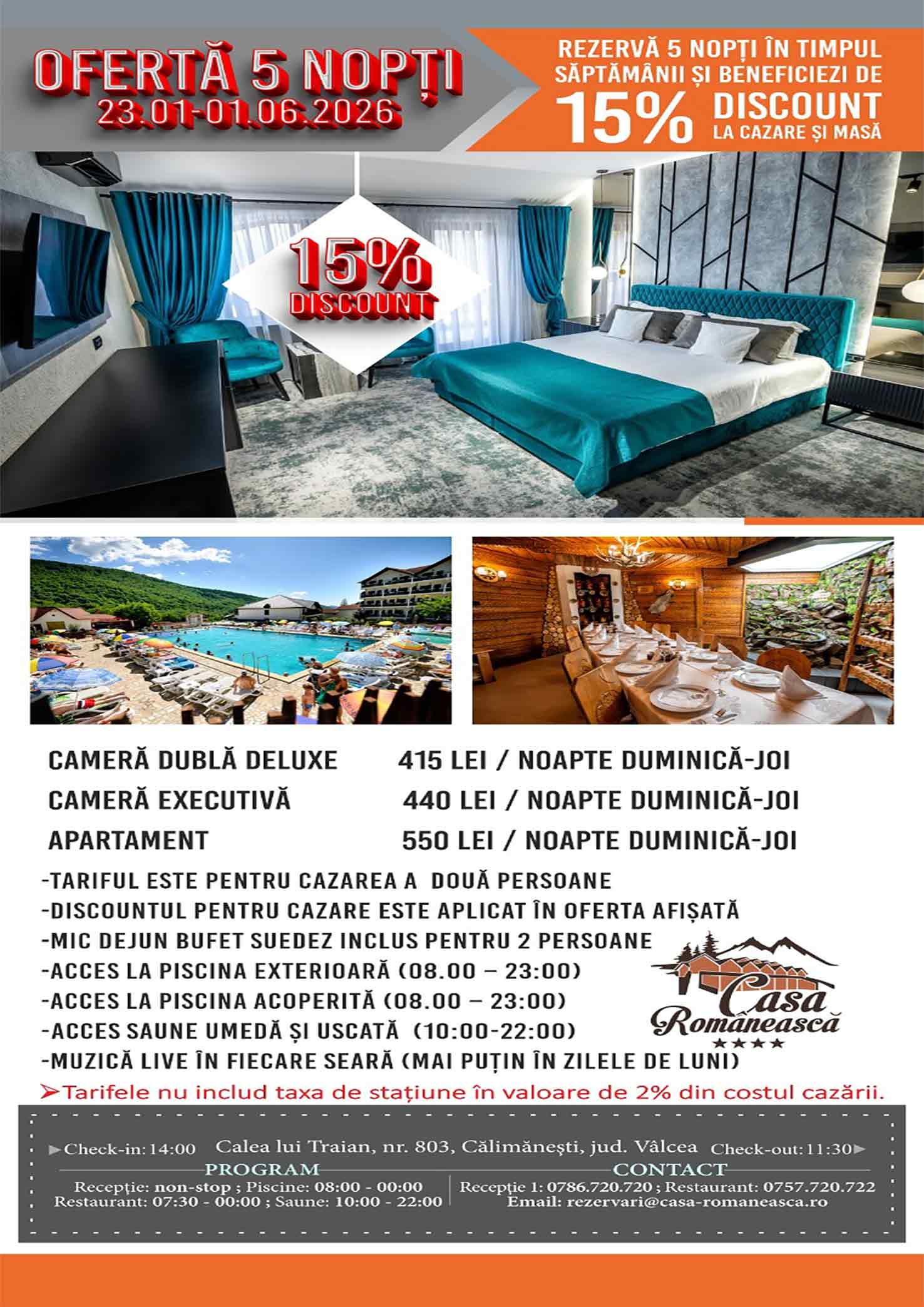 Rezervări și informații suplimentare la numărul de telefon 0786.720.720, adresa de email rezervari@casa-romaneasca.ro sau printr-un mesaj privat pe Facebook.