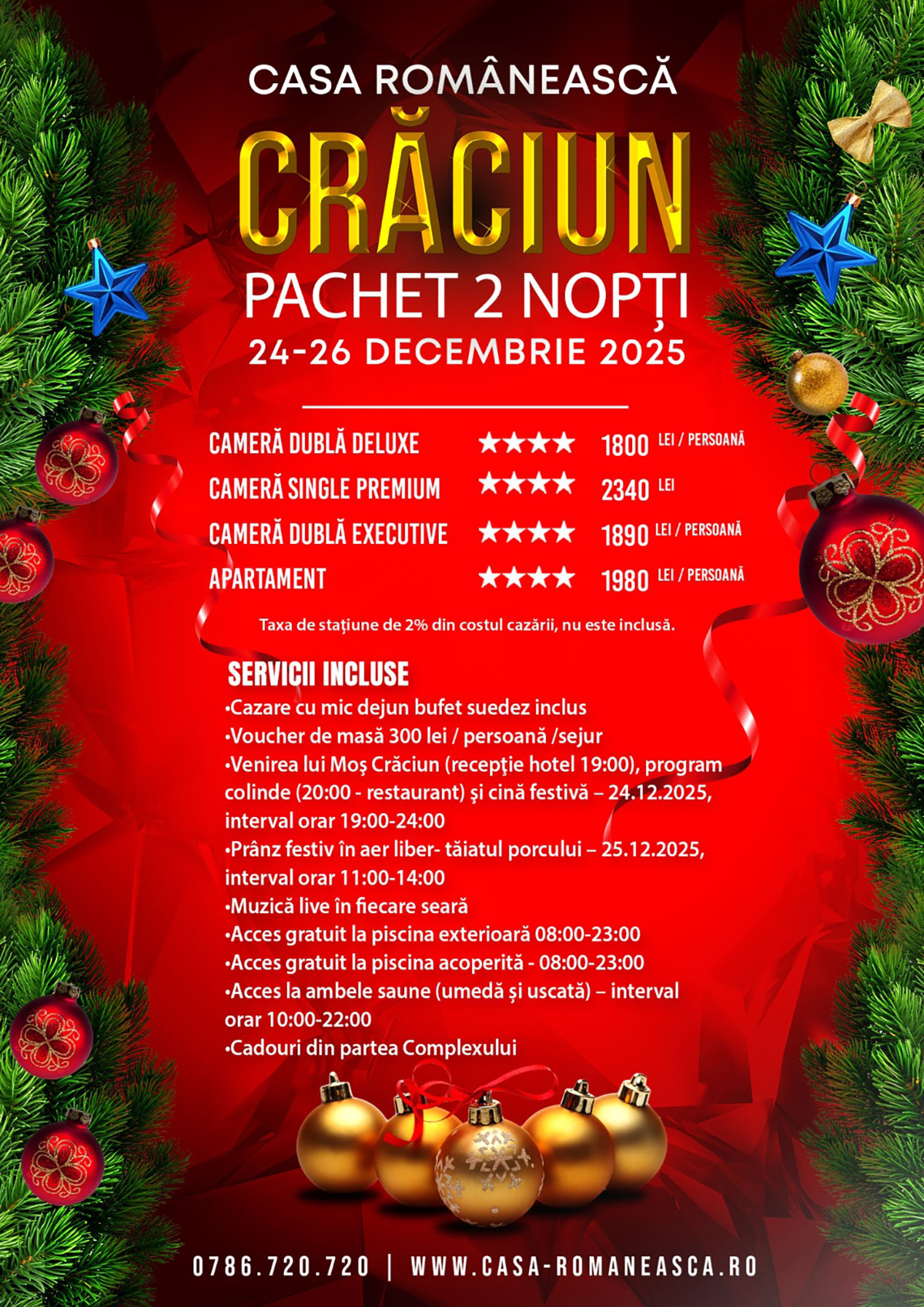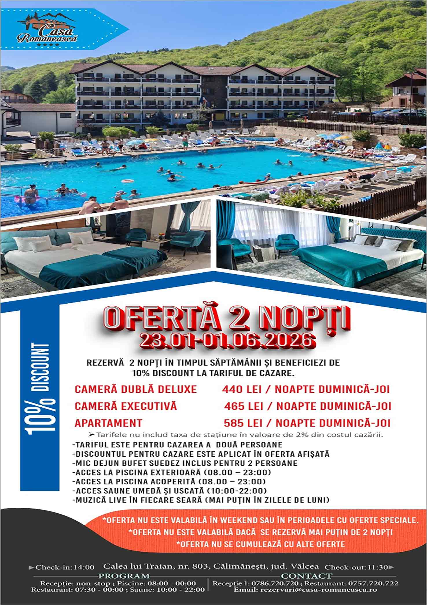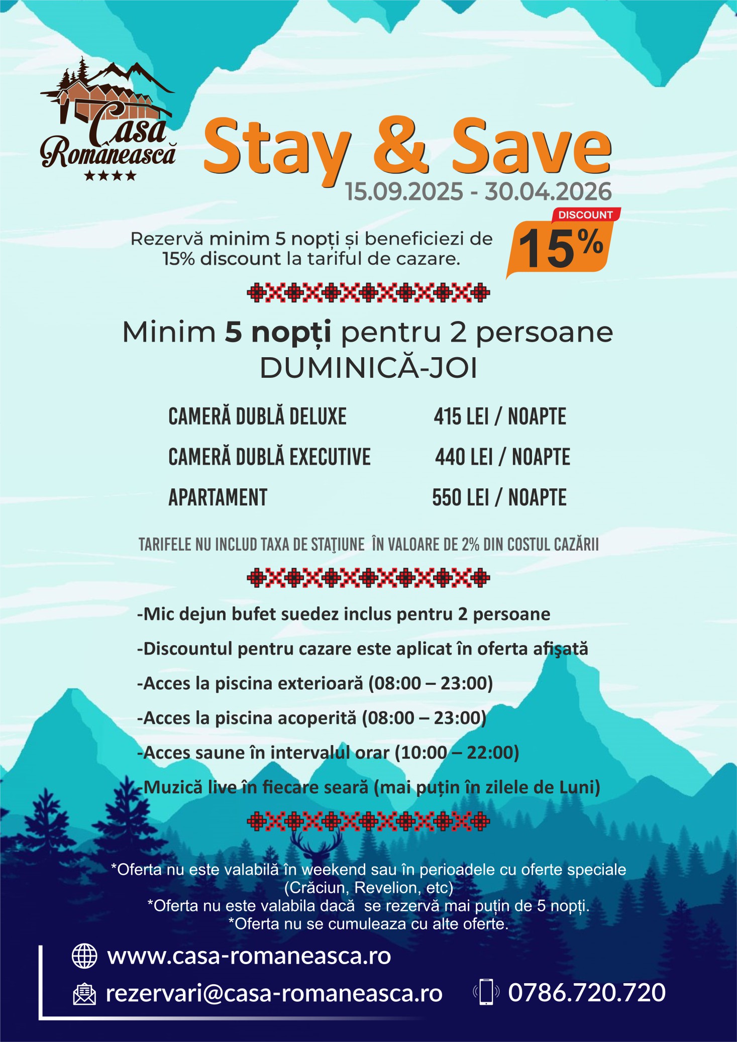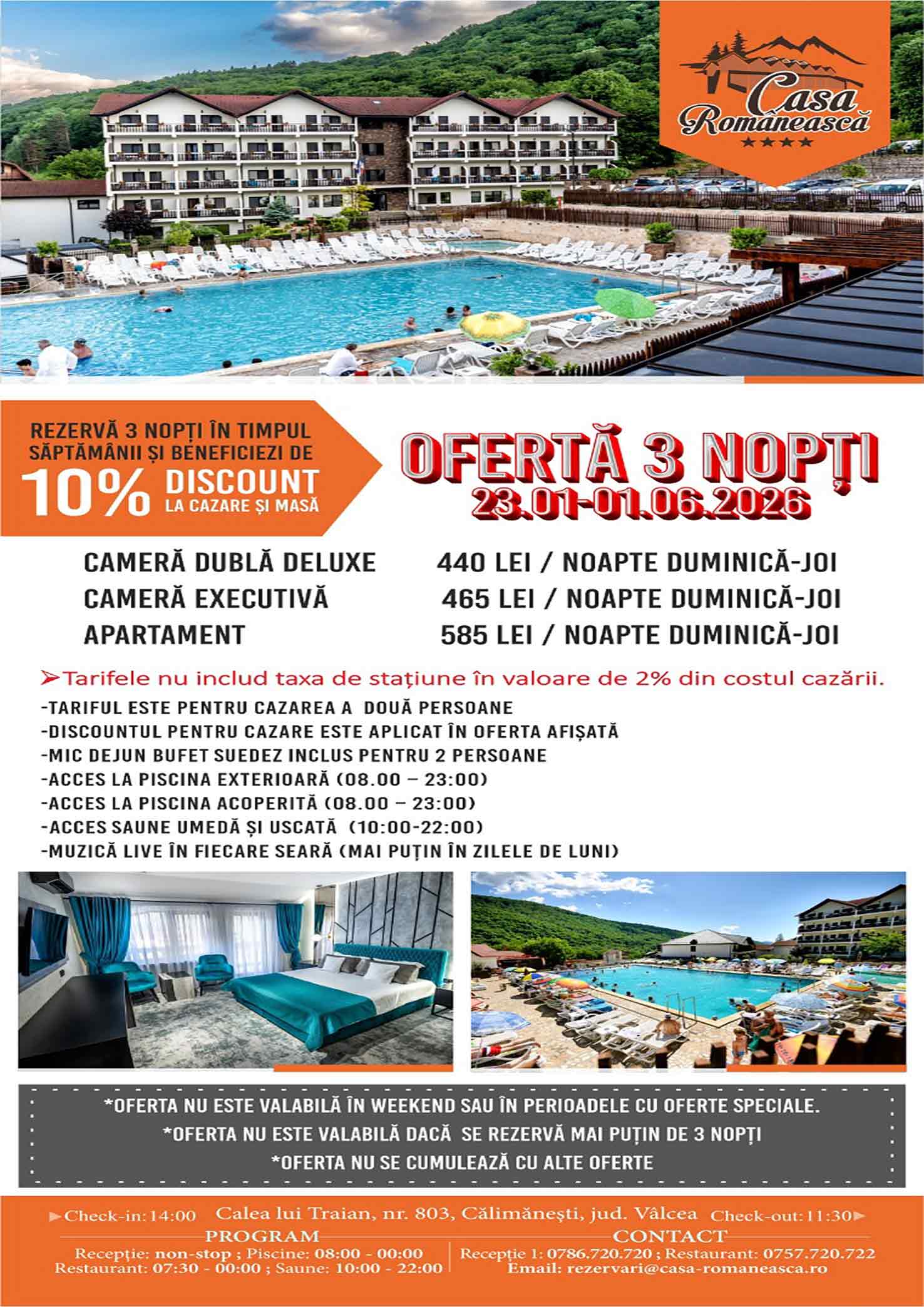Rezervări și informații suplimentare la numărul de telefon 0786.720.720, adresa de email rezervari@casa-romaneasca.ro sau printr-un mesaj privat pe Facebook.